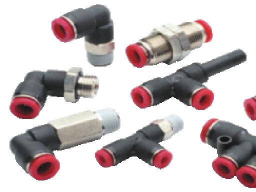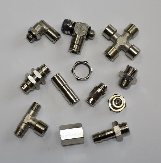 (u.a. Gerade Verschraubung, Winkelverschraubung, T-Verschraubung, Steckverbindung, Doppelnippel, Reduziernippel, Stopfen, Schlauchtülle, Muffe, Winkelstück, T-Stück, Verteiler, Ausblaspistole)